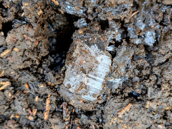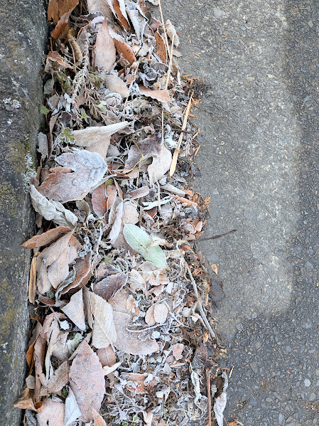 道路脇に吹き溜まった落ち葉には白く霜が付いていました。