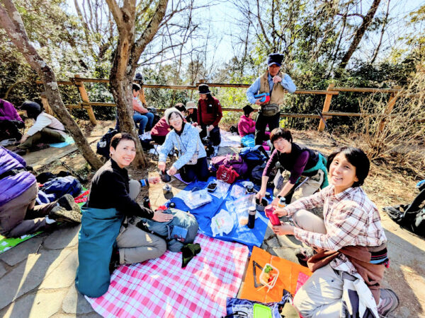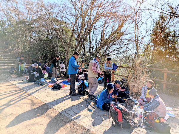 山頂広場は人が多すぎるので、手前の空いたところで食事の用意です。