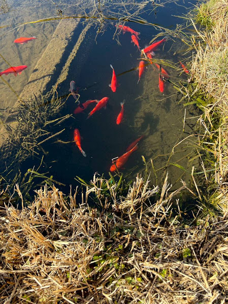 池には真っ赤な金魚が群れていました。