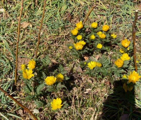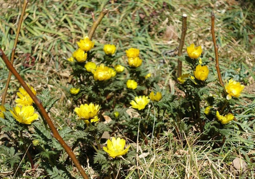 足元には黄色い福寿草が。