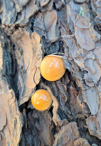 直立する生きた松の幹に丸いキノコ。