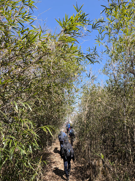 背丈以上の高さがある笹やぶを抜けて進みます。