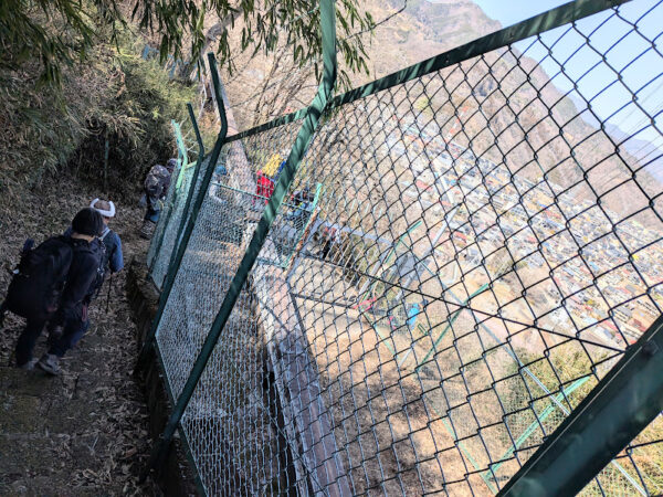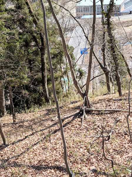 山道が開けて、正面右側に街並みの風景が飛び込んできました。