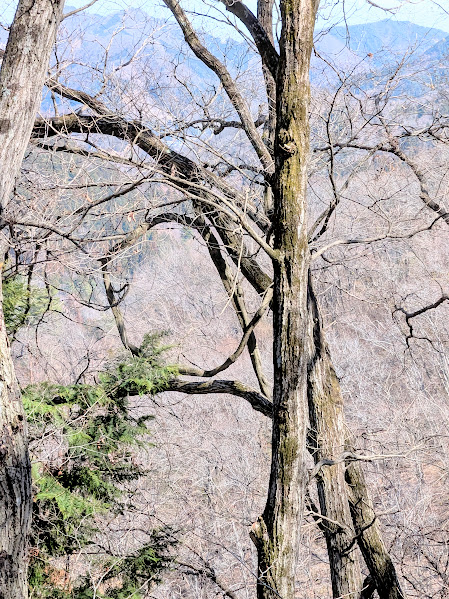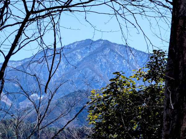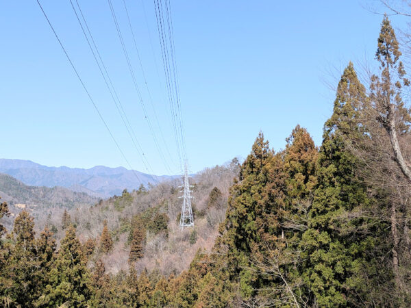 右手には木々の間から山々の稜線が透けて見えます。
