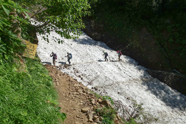 途中、雪渓を横切るポイントがありました。足元に注意しながら進みます。