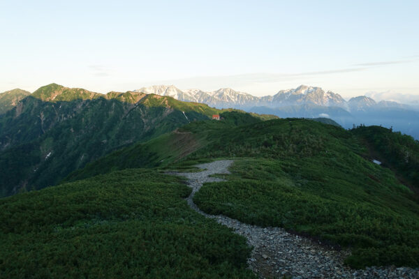 2日目、冷池山荘に向けて歩きます。振り返ると種池山荘が小さく見え、その奥には雄大な山々が広がっていました。